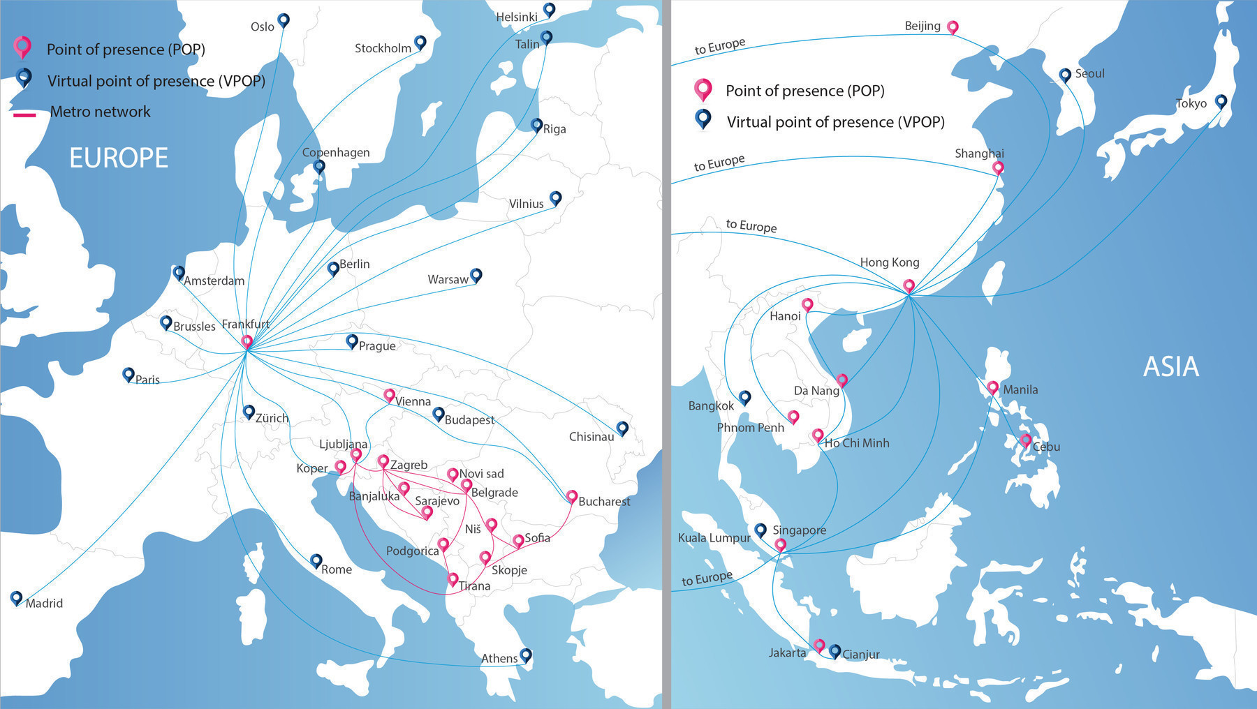 Jaringan SoftNET berfokus pada konektivitas dengan latensi yang rendah di seluruh dunia melalui POP yang kami operasikan sendiri di Eropa (Jerman, Austria, Slovenia, Kroasia, Bosnia dan Herzegovina, Serbia, Bulgaria, Rumania, Makedonia, Montenegro, Albania) dan Asia (Cina, Vietnam, Singapura, Indonesia, Filipina).